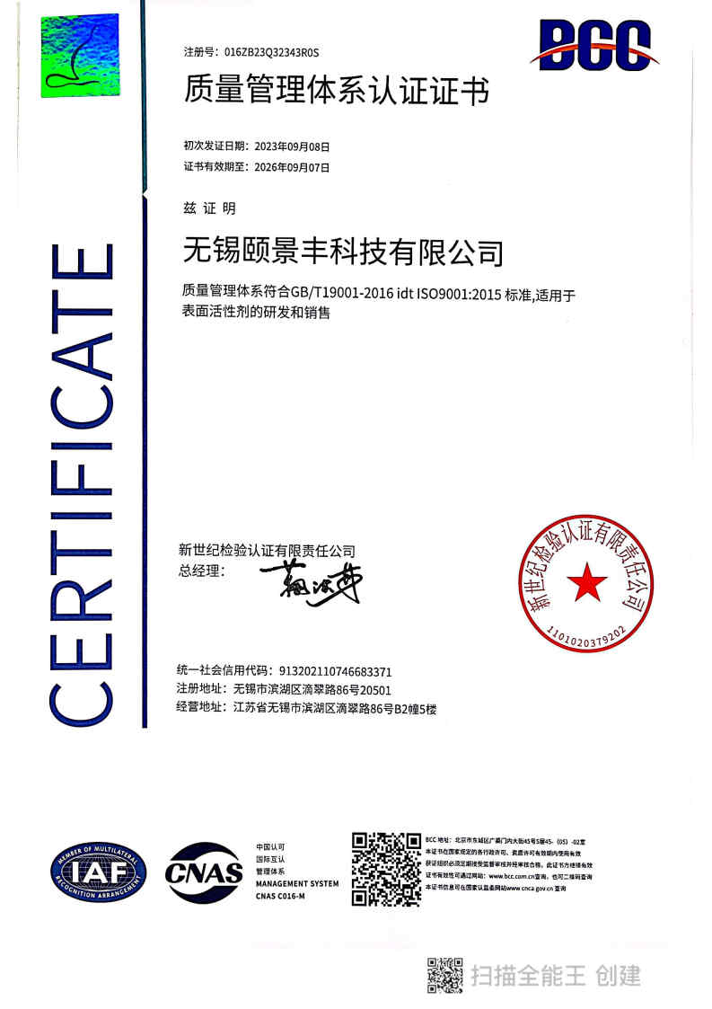 無錫頤景豐科技有限公司是專門生產,研發和銷售高分子表面活性劑的生產企業。公司成立于2013年,位于江蘇省無錫蠡園開發區。公司距上海200公里左右,環境優美,交通極為便利。公司自成立起,引進了先進的技術,設備和人才,且擁有自己一流的研發機構及農藥制劑實驗室,為農藥生產企業提供優質的助劑產品。本公司生產基地位于宜興,產能 15000噸/年, 生產各類固體及液體分散劑,潤濕劑,乳化劑以及增效劑,產品廣泛應用在SC,SL,EC,OD,WP,WDG,TM等劑型中。公司以嚴密的質量控制系統和檢測體系及周到的服務確保為用戶提供滿意的產品。我們的經營理念是以專業的技術,優秀的產品,良好的服務與合作伙伴共同成長。